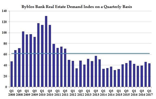 Byblos Bank Headquarters, May 22, 2017: Byblos Bank issued today the results of the Byblos Bank Real Estate Demand Index for the first quarter of 2017. The results show that the Index posted a monthly average of 43.5 points in the first quarter of 2017, constituting a decline of 6.3% from 46.5 points in the fourth quarter of 2016 and an increase of 2.4% from 42.5 points in the first quarter of 2016. Further, the results for the first quarter of 2017 constitute the 12th lowest level in 39 quarterly readings. Commenting on the results, Mr. Nassib Ghobril, Chief Economist and Head of the Economic Research and Analysis Department at the Byblos Bank Group, said "demand for residential real estate in Lebanon decelerated in the first quarter of 2017 following a 17.5% surge in the fourth quarter of 2016, as the government's focus on increasing taxes on consumption, income and profits in the first three months of the year, as well as the endless political bickering over a new parliamentary election law, halted the momentum in consumer confidence that started in the fourth quarter of 2016. In turn, these developments impacted the residential real estate sector, given that demand for housing in Lebanon is primarily correlated to consumer confidence, political stability and economic activity." As a result, the Index decelerated in each of the first three months of the year, with the March outcome representing a retreat of 54% from the Index’s recent peak of 65.9% reached in December 2016. Further, the Index’s average monthly score in the first quarter of 2017 is 66.8% lower from the peak of 131 points registered in the second quarter of 2010, and remains 60.4% below the annual peak of 109.8 points posted in 2010. Also, it is 29.7% lower than the Index's monthly trend average score of 61.9 points since the Index’s inception in July 2007. Mr. Ghobril indicated that "the end of the political stalemate in the fourth quarter of 2016 had a limited impact on the housing market because it was not accompanied by additional measures to stimulate demand.” In fact, the answers of respondents to the Index's survey questions in the first quarter show that only 4.9% of Lebanese residents had plans to either buy or build a residential property in the coming six months. The share of residents who had plans to buy or build a residential property in Lebanon gradually decreased from 7.5% in December 2016 to 6.4% in January, 5% in February and 3.4% in March 2017. In comparison, 7% of residents in Lebanon, on average, had plans to buy or build a residential property in the country between July 2007 and March 2017, with this share peaking at nearly 15% in the second quarter of 2010.