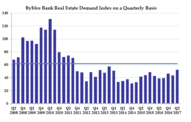 Byblos Bank Headquarters, August 9, 2017: Byblos Bank issued today the results of the Byblos Bank Real Estate Demand Index for the second quarter of 2017. The results show that the Index posted a monthly average of 52.3 points in the second quarter of 2017, constituting an increase of 20.2% from 43.5 points in the first quarter of the year and a rise of 34.3% from 38.9 points in the second quarter of 2016. Further, the results for the second quarter of 2017 constitute the 17th highest level in 40 quarterly readings. Commenting on the results, Mr. Nassib Ghobril, Chief Economist and Head of the Economic Research and Analysis Department at the Byblos Bank Group, said: "Accommodative policies of low interest rates on mortgages in Lebanon, the renewal of the term of Banque du Liban’s Governor Riad Salamé that increased confidence in the stability of the currency, and relative political stability, are all factors that may have supported the near-term plans of potential buyers”. However, Mr. Ghobril cautioned that "it is too early to see a trend in the rise of the Index's value, given that the increase is from a very low base". In fact, the Index’s average monthly score in the second quarter of 2017 is still 60.1% lower from the peak of 131 points registered in the second quarter of 2010, and remains 52.4% below the annual peak of 109.8 points posted in 2010. Also, it is 15.2% lower than the Index's monthly trend average score of 61.7 points since the Index’s inception in July 2007. In addition, Mr. Ghobril pointed out that "the Index's results reflect the intentions of Lebanese to buy or build a house, but these intentions need a conducive environment to translate into actual sales". He added that "demand for housing in Lebanon is primarily correlated to political stability, consumer confidence and economic activity, which continue to be at low levels and constitute a drag on demand". In fact, the share of residents who had plans to buy or build a residential property in Lebanon gradually decreased from 7.5% in December 2016 to a low of 3.4% in March 2017 during the first six months of the year, before improving to 7% in June. He noted that “the fluctuations in the residents' intentions to buy or build a house shows that demand for residential real estate has yet to stabilize.”