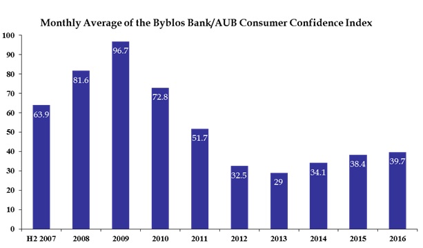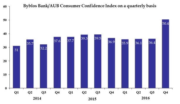 Byblos Bank issued today, in cooperation with the Olayan School of Business at the American University of Beirut, the results of the Byblos Bank/AUB Consumer Confidence Index for the fourth quarter of 2016. The results show that the Index increased by 3.5% in October, grew by 2.2% in November and rose by 79% in December 2016. Further, the Index averaged 50.4 in the fourth quarter of 2016 and improved by 38.6% from 36.4 in the third quarter of the year. The fourth- quarter results were the highest in 21 quarters and the 17th highest since the start of the Index's calculation in July 2007, while the quarter-on-quarter growth rate was the highest since the second quarter of 2008. In addition, the Byblos Bank/AUB Present Situation Index averaged 48.4 in the fourth quarter of 2016 and increased by 33.2% from the preceding quarter, while the Byblos Bank/AUB Expectations Index averaged 51.7 and jumped by 42.3% from the third quarter of 2016. Commenting on the results, Mr. Nassib Ghobril, Chief Economist and Head of the Economic Research and Analysis Department at the Byblos Bank Group, said “the election of General Michel Aoun as President in October, the swift nomination of Mr. Saad Hariri as Prime Minister in November, and the formation of a government of national unity in December, caused the level of consumer confidence to pick up substantially in the fourth quarter of 2016.” Mr. Ghobril noted that “consumer confidence has proven historically to be very sensitive to political and security developments, whether they are positive or negative. The positive political shock that ended the 30-month presidential vacuum in the country and restored the proper functioning of the government and parliament was the key factor for the surge in household sentiment.” However, the average monthly score of the Index in the fourth quarter of 2016 constituted a decline of 52.4% from the quarterly peak score of 105.8 registered in the fourth quarter of 2008, and a drop of 48% from the annual peak score of 96.7 reached in full year 2009. Also, the fourth-quarter results of 2016 were 5.8% lower than the monthly trend average score of 53.5 since the inception of the Index in July 2007.